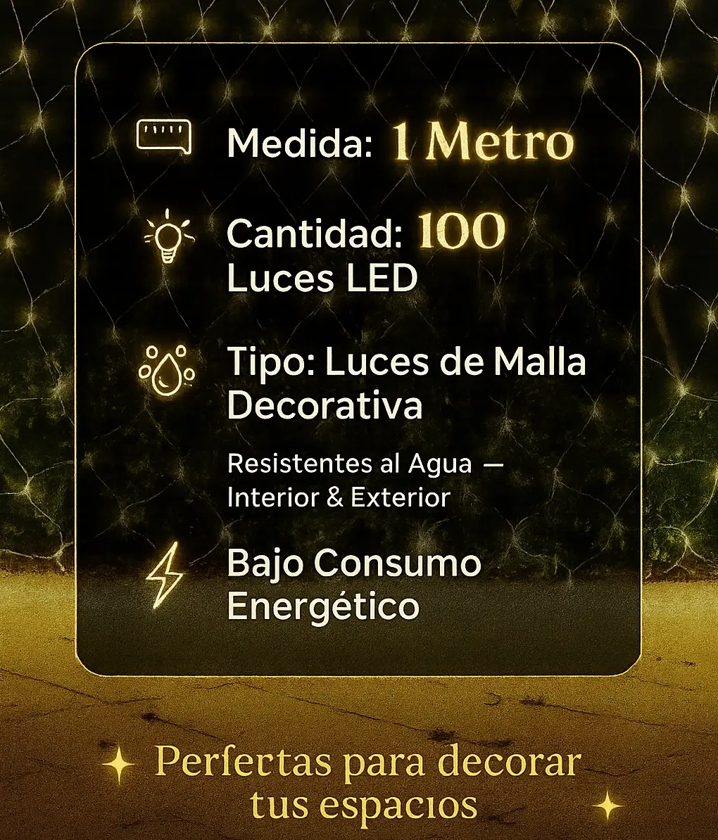 📏 Cada malla mide 1 metros y contiene 100 luces LED, distribuidas de forma uniforme para lograr un brillo cálido y elegante.