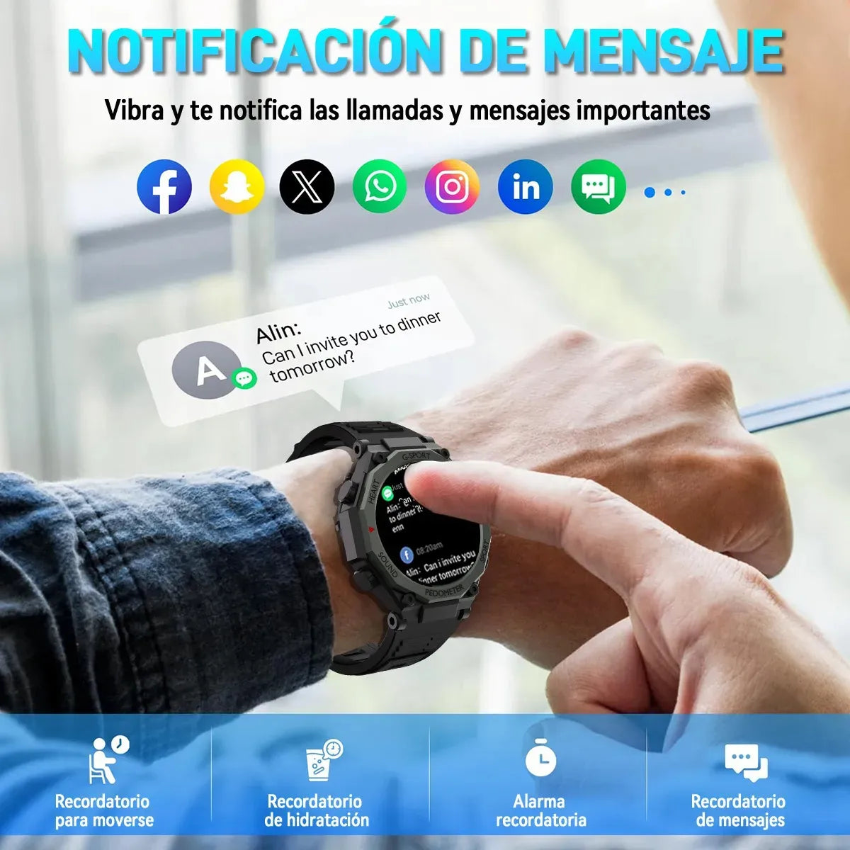 Claro que sí. Puedes recibir notificaciones de llamadas, WhatsApp y otras apps directamente en tu muñeca sin sacar el celular.